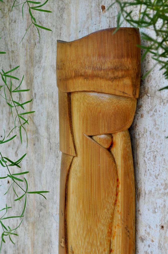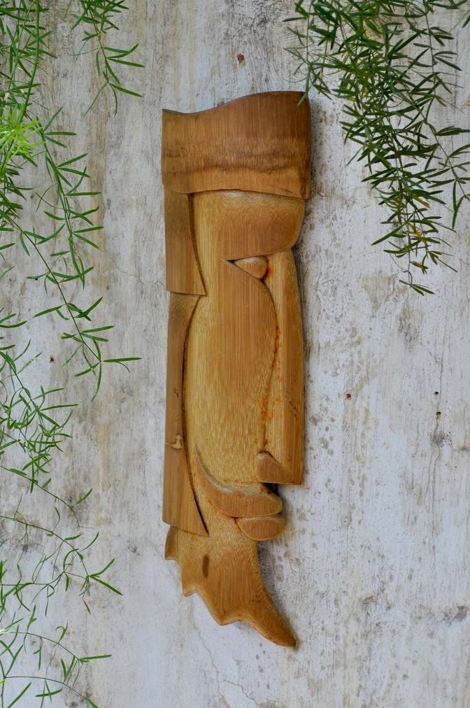 The canvas for this mask is a 12" diameter D. Giganteus bamboo. The intricacy of the mask is achieved by carving using sharp tools and the colors are achieved by using a combination of gas torch and organic colors.