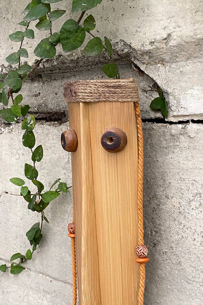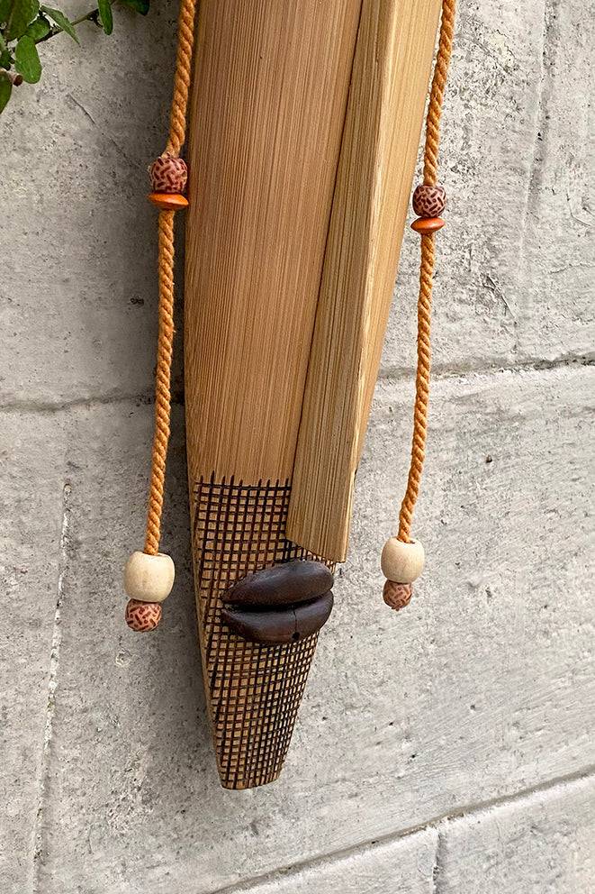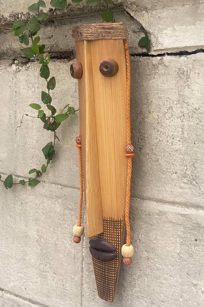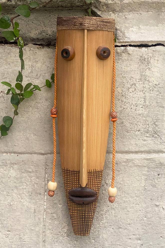 The canvas for this mask is a 12" diameter D. Giganteus bamboo. The intricacy of the mask is achieved by carving using sharp tools and the colors are achieved by using a combination of gas torch and organic colors.