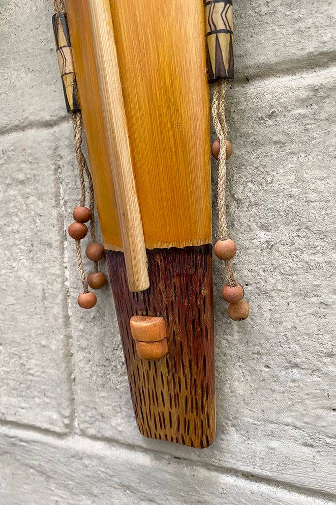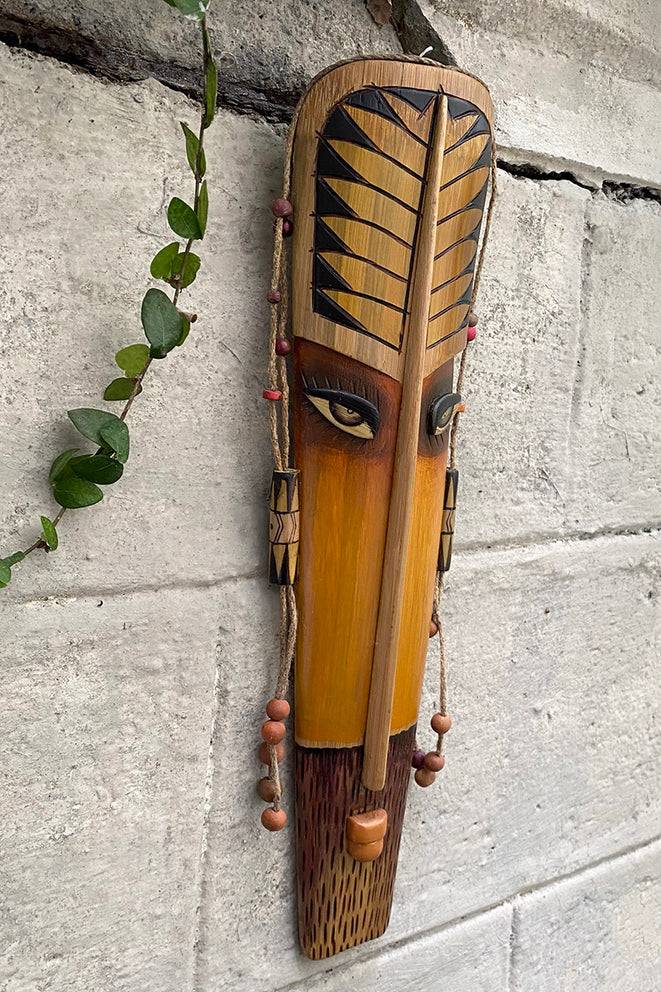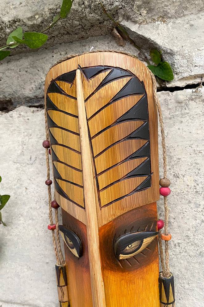 The canvas for this mask is a 12" diameter D. Giganteus bamboo. The intricacy of the mask is achieved by carving using sharp tools and the colors are achieved by using a combination of gas torch and organic colors.